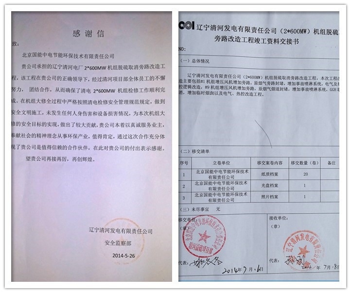 在公司總部的正確領(lǐng)導(dǎo)下,經(jīng)過清河EPC旁路改造項目部全體成員的共同努力,7月18日,遼寧清河發(fā)電有限責(zé)任公司業(yè)主代表在竣工資料交接證書上簽字,標志著我公司承擔的遼寧清河電廠2*600MW機組脫硫取消旁路改造工程正式竣工驗收,成功打響了我司在中國電力投資集團的第一槍。