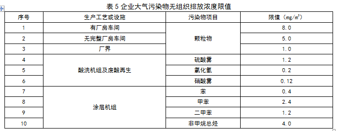 企業(yè)邊界大氣污染物任何1小時平均濃度執(zhí)行表5規(guī)定的限值。